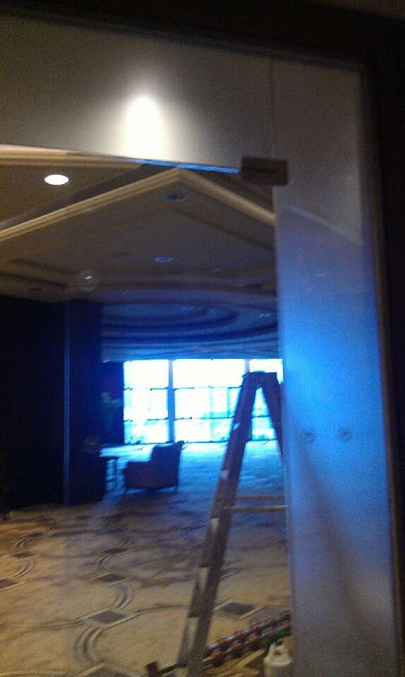 大中华喜来登酒店办宴会需要,通道大门玻璃贴隔热膜:磨砂膜,装饰膜,可以快速隔断两个大厅,需要连起来时撕磨砂膜即可。方便快捷,节约成本。